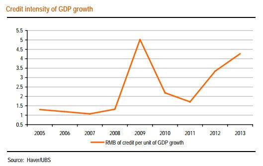 The primary problem that China faces today is its credit boom, both official and nonofficial (known as shadow banking). The following Charts pictorially show the problem. Not only is the credit/debt growing to record levels (CHART XVIII), since the later part of 2012 it is growing inversely to the GDP growth (CHART XIX).